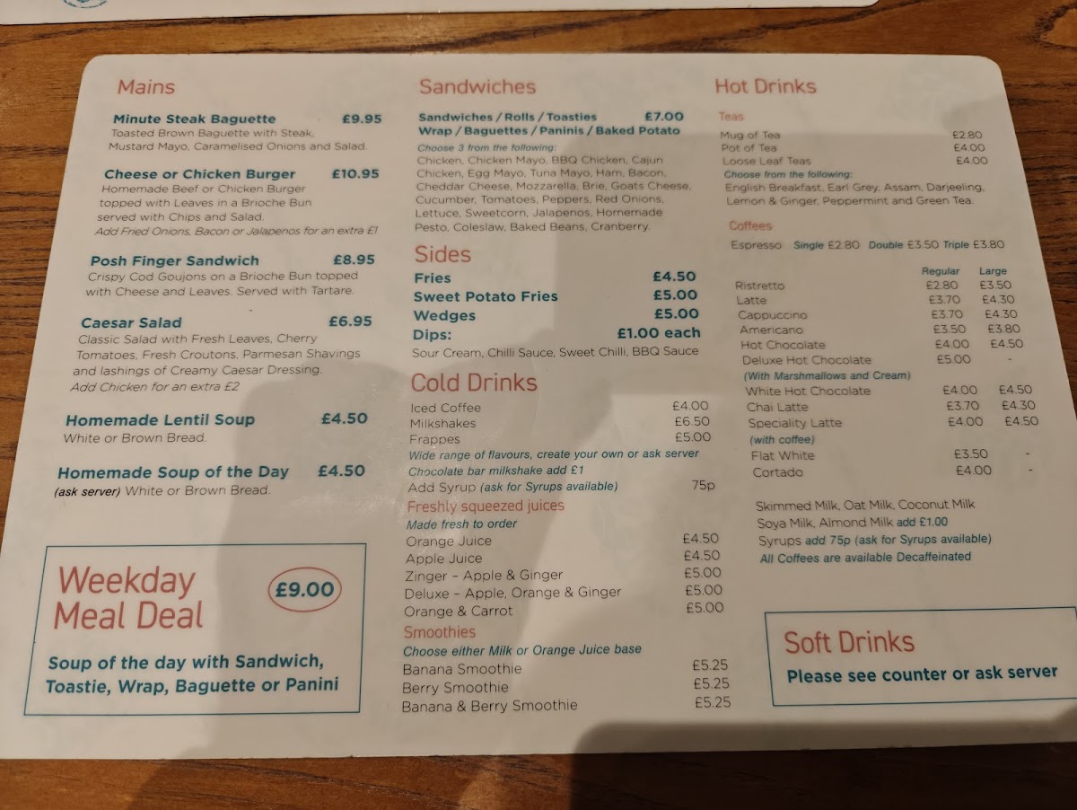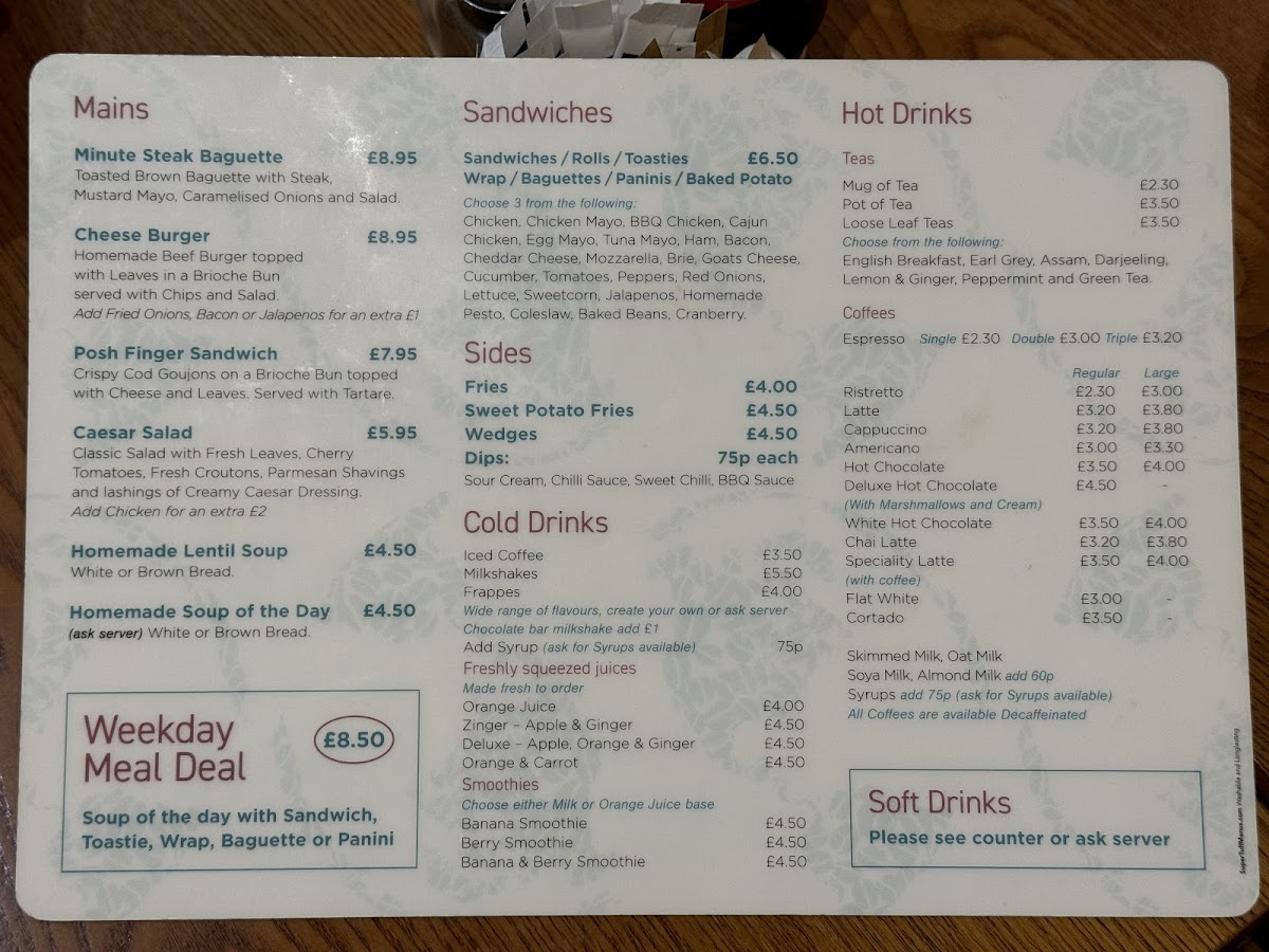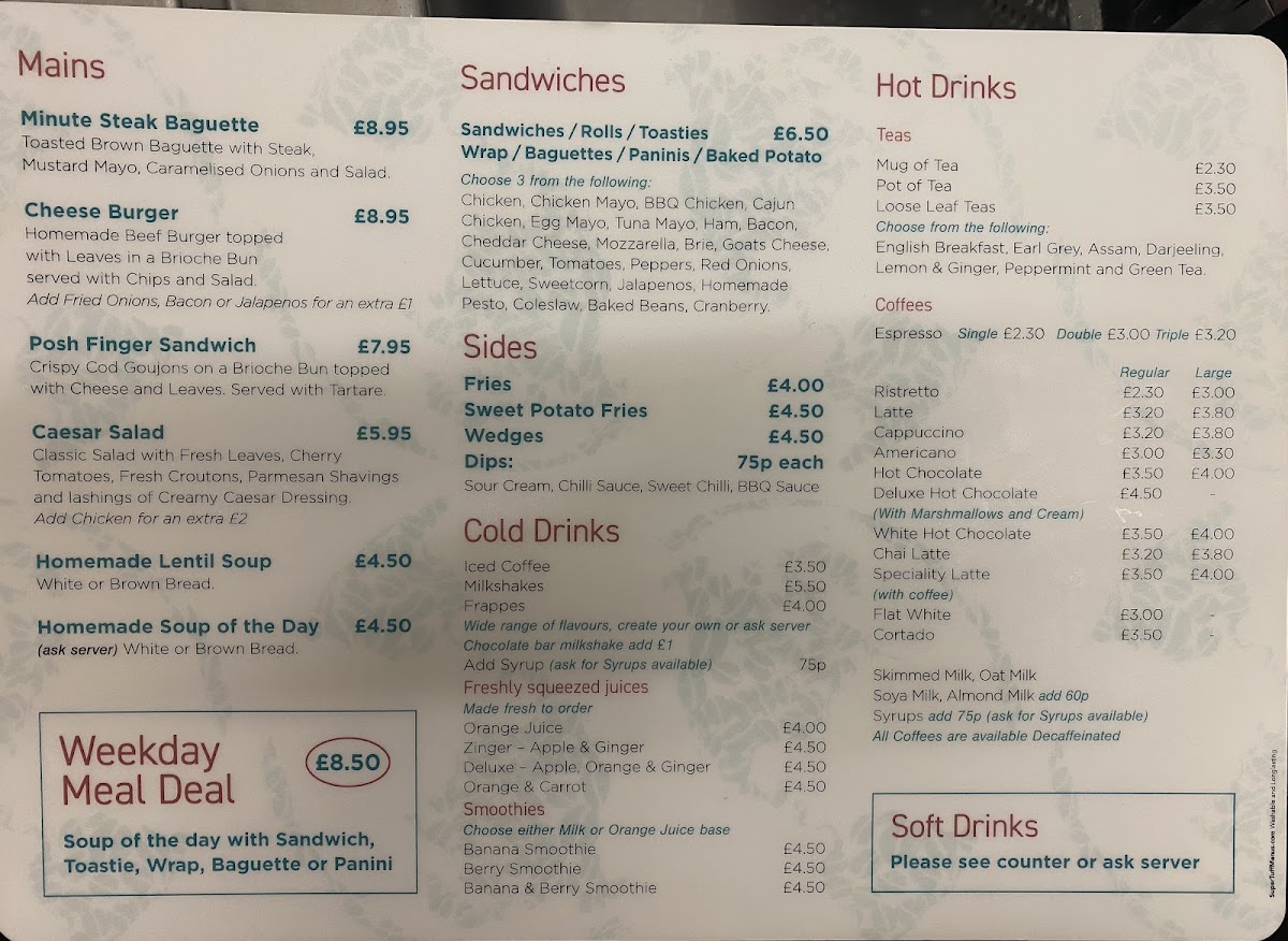 For lunch, the menu shines with a selection of sandwiches, burgers, and fresh salads, ideal for a midday pick-me-up. You can enjoy fresh and vibrant salads or opt for a hearty sandwich or burger. Whether you're after a Tuna Mayonnaise or a Chicken Mayonnaise & Bacon sandwich, or prefer something with a bit more zing like the Cajun Chicken & Cheese, there’s something to please every palate. The Baked Potato-Time section is also a highlight, offering comfort food options like Baked Beans and Cheese or a filling Chicken Mayonnaise & Bacon topping.