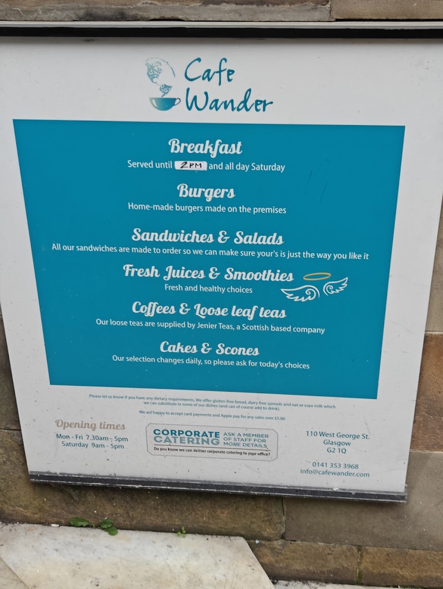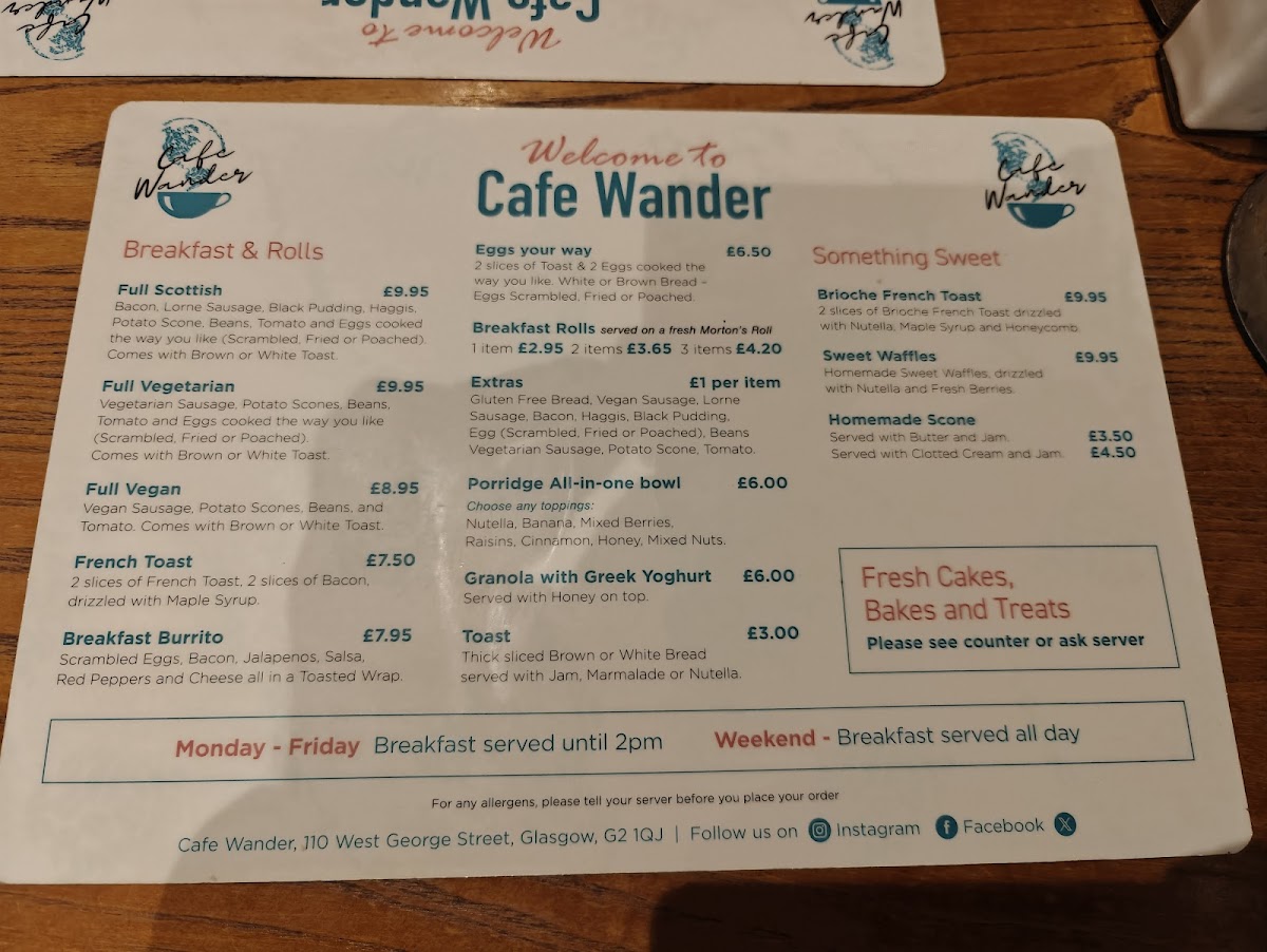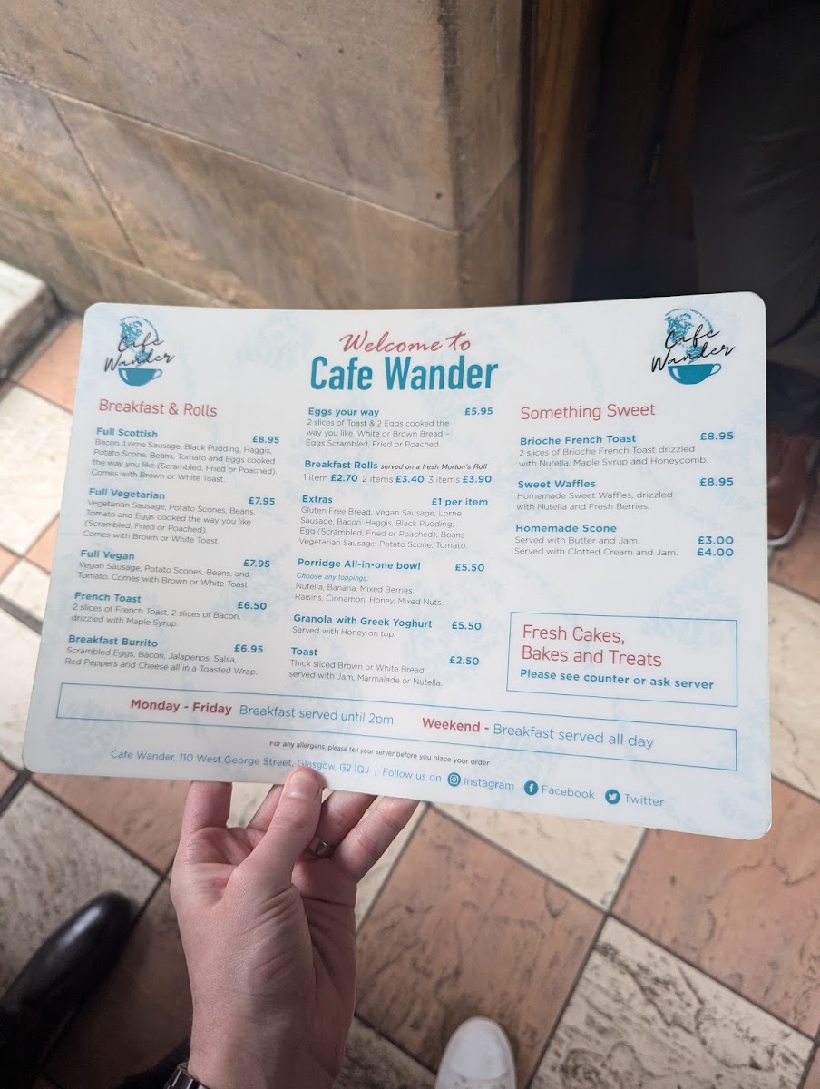 Cafe Wander's menu offers a delightful blend of hearty breakfast options, light bites, and indulgent sweet treats, making it a fantastic spot for any time of day. For breakfast, the Cafe Wander Menu provides a variety of delicious choices, including the traditional Full Scottish breakfast, perfect for those looking for a substantial meal to start the day. If you're after something lighter or vegetarian, options like the Full Vegetarian and Full Vegan breakfasts cater to all tastes. There's also the classic "Eggs Your Way" and a range of breakfast rolls filled with everything from crispy bacon to creamy avocado. If you're in the mood for something sweet, the Brioche French toast and sweet waffles are the perfect choice to satisfy your cravings.